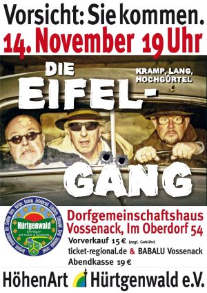 Seit vielen Jahren ist die Eifel Gäng eine feste Größe im Kulturbetrieb unserer Region. Günter Hochgürtel, Ralf Kramp und Manfred Lang sind dafür bekannt, von der Bühne aus die Zwerchfelle der Besucher ordentlich zu strapazieren. In dieser Tradition sind die drei im Dorfgemeinschaftshaus in Vossenack auf Einladung unseres Kulturvereins HöhenArt e.V. zu Gast.